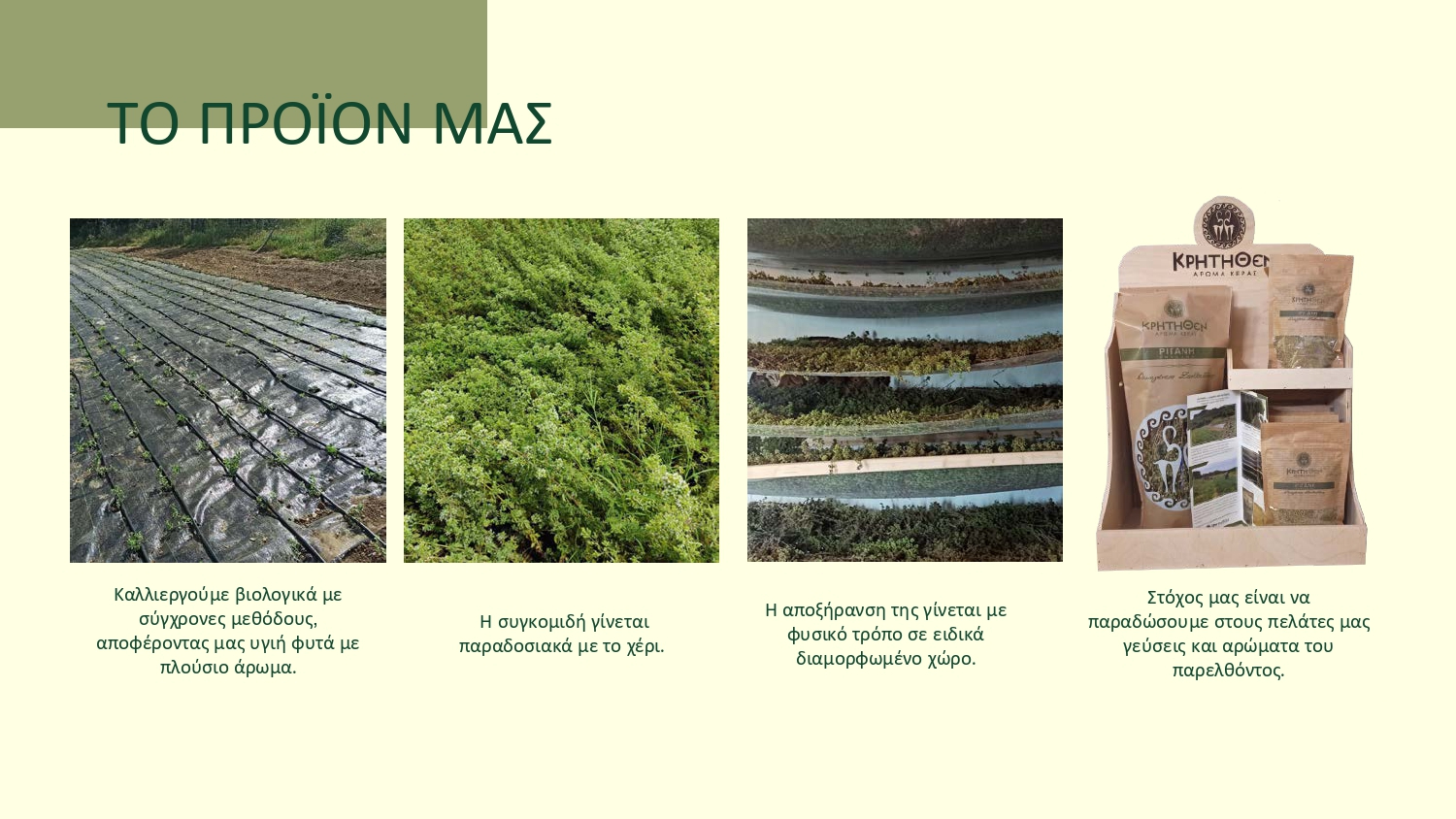 Ένα μικρό χωριό της Κρήτης στην επαρχία Κισσάμου στα Χανιά, η Κερά, έμελλε να είναι ο τόπος όπου ένα όνειρο ζωής εκπληρώθηκε. Εκμεταλλευόμενοι την ιδιομορφία της Κρητικής γης και το κλίμα του τόπου μας, δημιουργήσαμε μια παραδοσιακή καλλιέργεια ρίγανης, έντονου αρώματος και πλούσιας γεύσης. Με απόλυτο σεβασμό στη μάνα Γη η καλλιέργεια της γίνεται χωρίς φυτοφάρμακα και λιπάσματα. Η συγκομιδή της γίνεται με το χέρι, η αποξήρανση της σε ειδικά διαμορφωμένο, καλά αεριζόμενο και σκιερό χώρο.